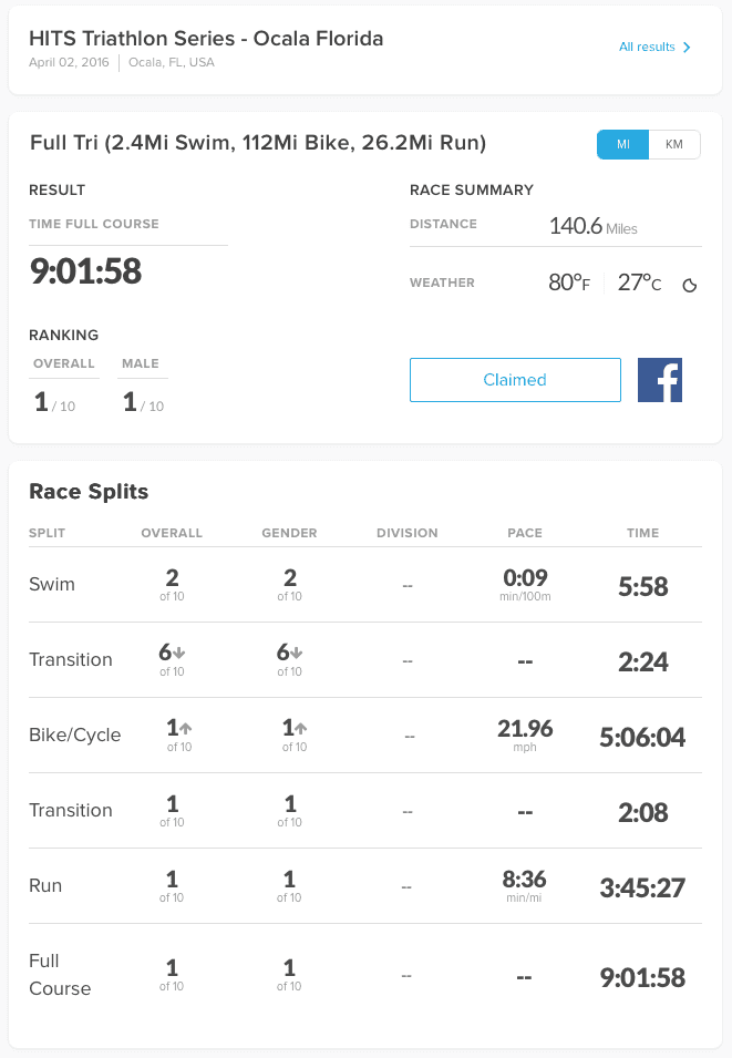 So I had big plans for 2016: Go under 10h, from a personal best of 10h15 in 2012. To do that, I’d do two full-distance races within six weeks: HITS Ocala in early April, as a dress rehearsal, and Texas in mid May as my A race.